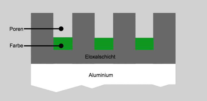 Zunächst entsteht eine relativ dünne, porenfreie Sperrschicht. Diese wächst weiter an und zu gut zwei Dritteln in das Aluminium hinein, während sich kapillarähnliche Poren bilden.